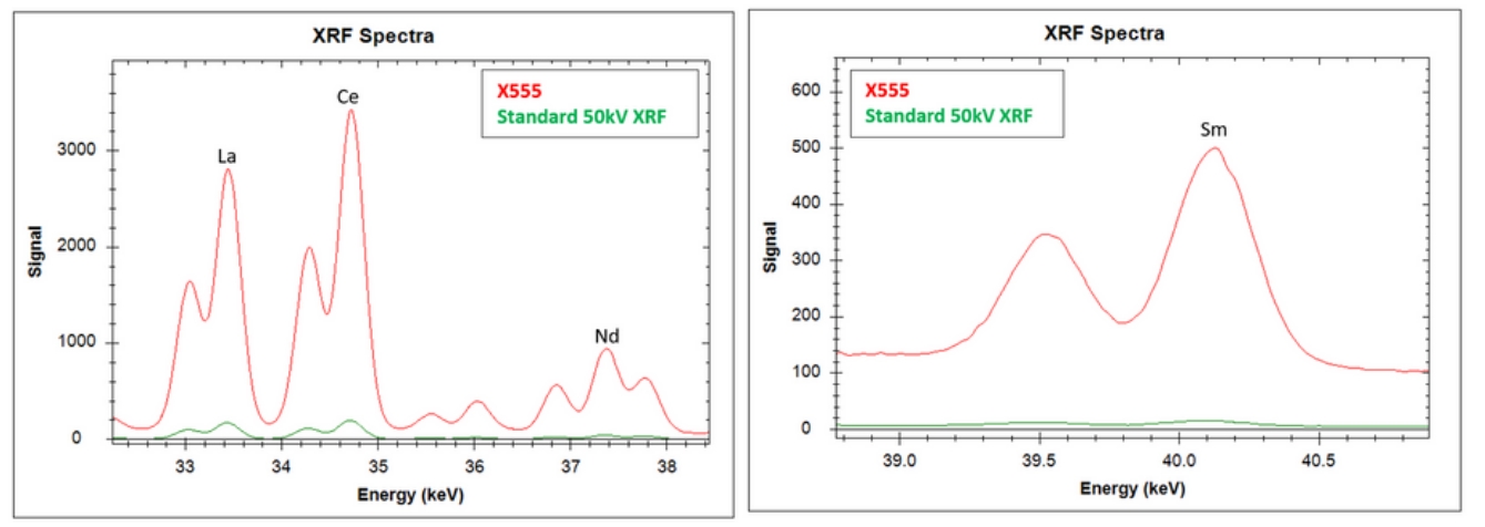 X-555利用55kV X射線管能更好地激發稀土元素能量。超大的70mm2 SDD硅源移探測器,更有效地檢測到更高的能量釋放,這實現了10倍更高的計數率(如:鑭)和30倍更高的計數率(如:釤Sm)。