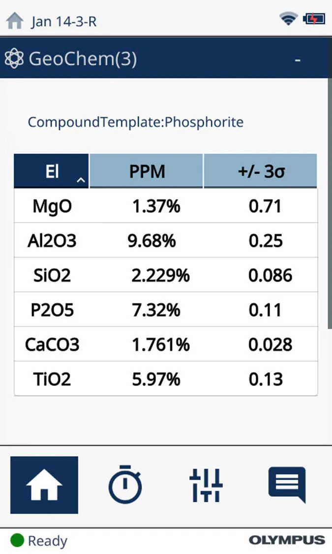 在計算元素含量的同時,奧林巴斯Vanta手持式XRF光譜儀還可以實時計算這些礦物質(zhì)和化合物的含量。通過便攜式光譜分析儀易于使用的用戶界面,用戶可以將光譜儀設(shè)置為將計算出的含量報告為化合物,如圖2所示。Vanta便攜式光譜分析儀的軟件可以進行這種計算,而且只需幾秒鐘就可以完成在元素報告和化合物報告之間的切換。