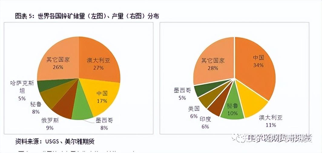 據(jù)美國地質(zhì)勘探局(USGS)2021年的報告顯示,全球已探明的鋅資源量為19億噸,鋅礦儲量為2.5億金屬噸。其中澳大利亞的鋅礦儲量最為豐富,約占到全球總儲量的27%。中國鋅礦儲量僅排名第二,約占全球總量的17%。其次分別為俄羅斯(占全球的9%)、墨西哥(8%)、秘魯(8%)、哈薩克斯坦(5%)等國。