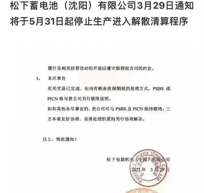 近日,位列世界500強企業松下株式會社旗下公司松下蓄電池(沈陽)工廠發布了一份公告,宣布將會在2023年5月31日前全面停止生產,進入解散清算程序并不再開展任何經營活動。意味著這個從1994年來沈陽投資建廠的企業結束了29年的生產,正式退出了中國市場。