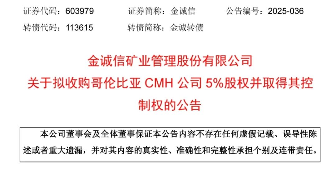 金誠信在哥倫比亞的投資已有多年。金誠信于2019年參股Cordoba礦業,后續公司在CMH公司層面直接持有50%的權益。公司表示,此次擬追加收購CMH公司5%股權,旨在深度參與Alacran銅金銀礦的后續開發建設。收購后按照持股比例對該項目后續建設進行投資,符合公司的長期發展規劃。