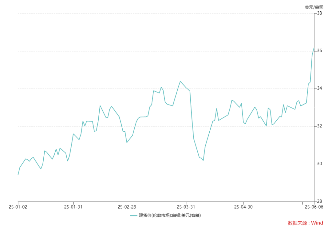 今年以來,在全球經濟和政治不確定性日益加劇的背景下,包括白銀在內的貴金屬價格受到避險資金的支撐。從年初至今,現貨白銀已累計漲逾23%。6月6日,現貨白銀價格最高報每盎司36.19美元,站上自2012年以來的新高。