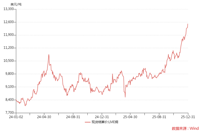 文華財經數據顯示,2023年、2024年LME銅年度漲幅分別為2.25%、2.56%,到2025年則大幅提升至42.3%。